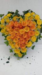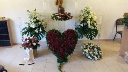 Trauergebinde, Gestecke in Herzform oder Kränze können traditionell mit Grün gestaltet werden, aus einem Blütenmeer bestehen, in der Farbgebung in Rot, Weiß oder auch in einer bunten Farbpalette gestaltet werden. Die Wahl der Blumen ist saisonal bedingt.